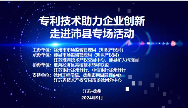 活动由徐州市市场监督管理局(知识产权局)主办,沛县市场监督管理局(知识产权局)江苏淮海技术产权交易